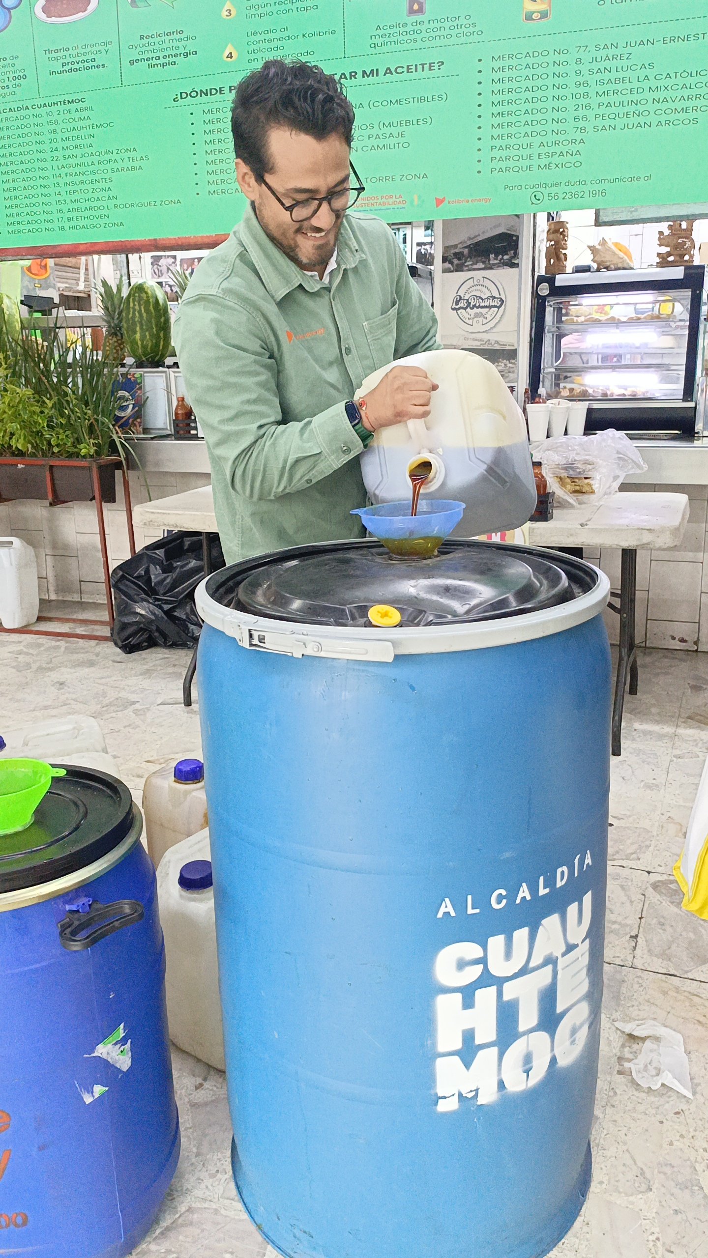 En alianza con la Delegación Cuauhtémoc, formamos parte del Programa “Unidos por la Sostenibilidad”, una iniciativa en la que los mercados de la delegación y otros espacios públicos son puntos de recolección de aceite de cocina usado.