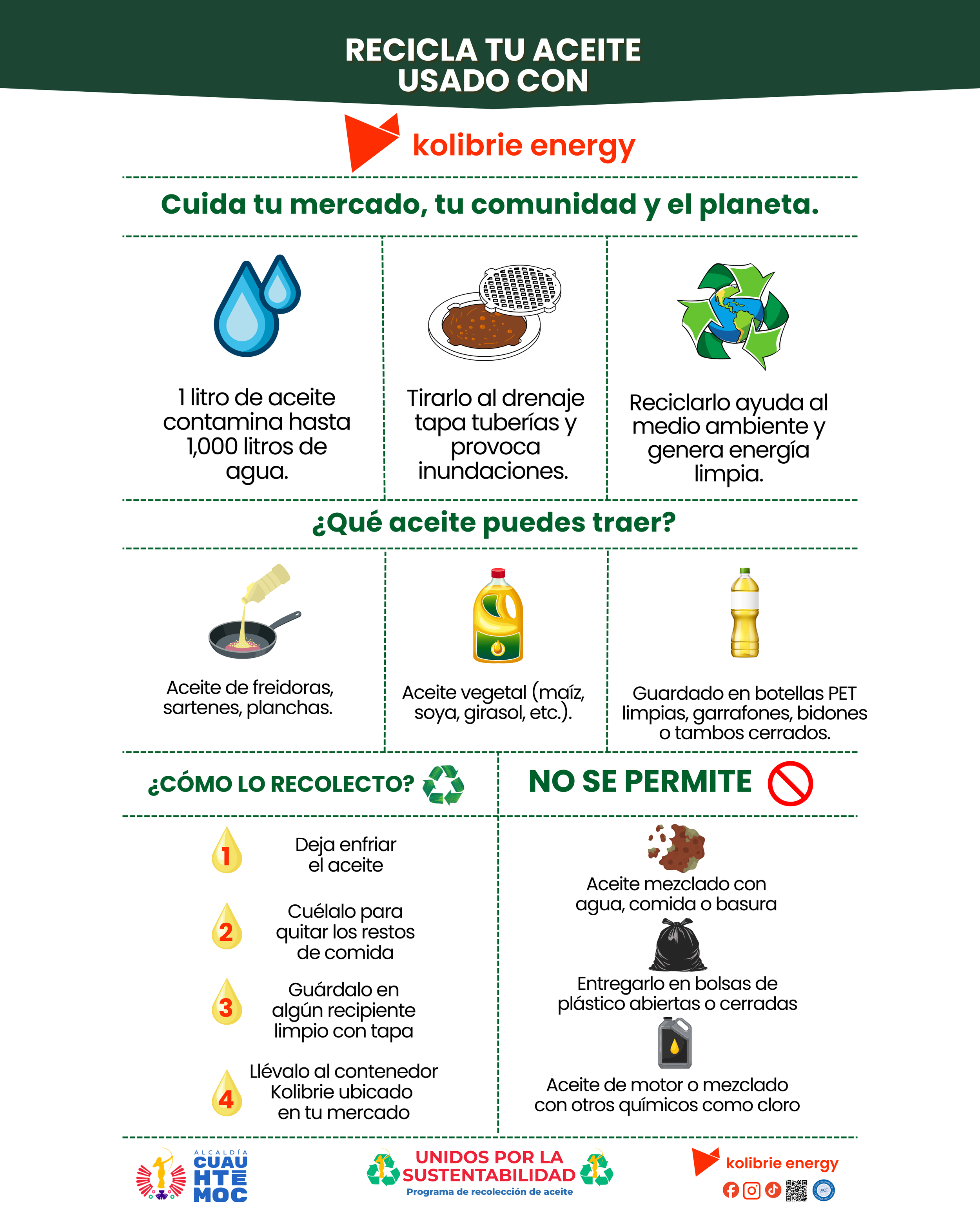 En septiembre de 2025, la Alcaldía Cuauhtémoc lanzó un programa de recolección de aceite en mercados públicos en alianza con Kolibrie Energy, instalando 12 contenedores de captación en mercados y espacios públicos de la demarcación: